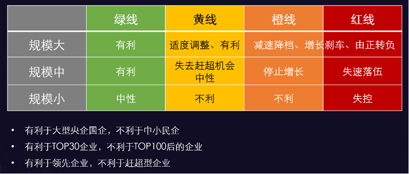 对于不同的企业,三条红线带来不同的战略选择。有的企业要刹车、减速降档,增长率会由正转负,有的企业反而可以乘势而上。