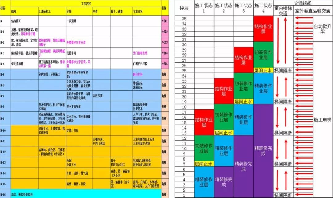 按照该模型,当结构施工至N层时,N-10层的装修湿作业刚好完成。各层的施工工序如下: